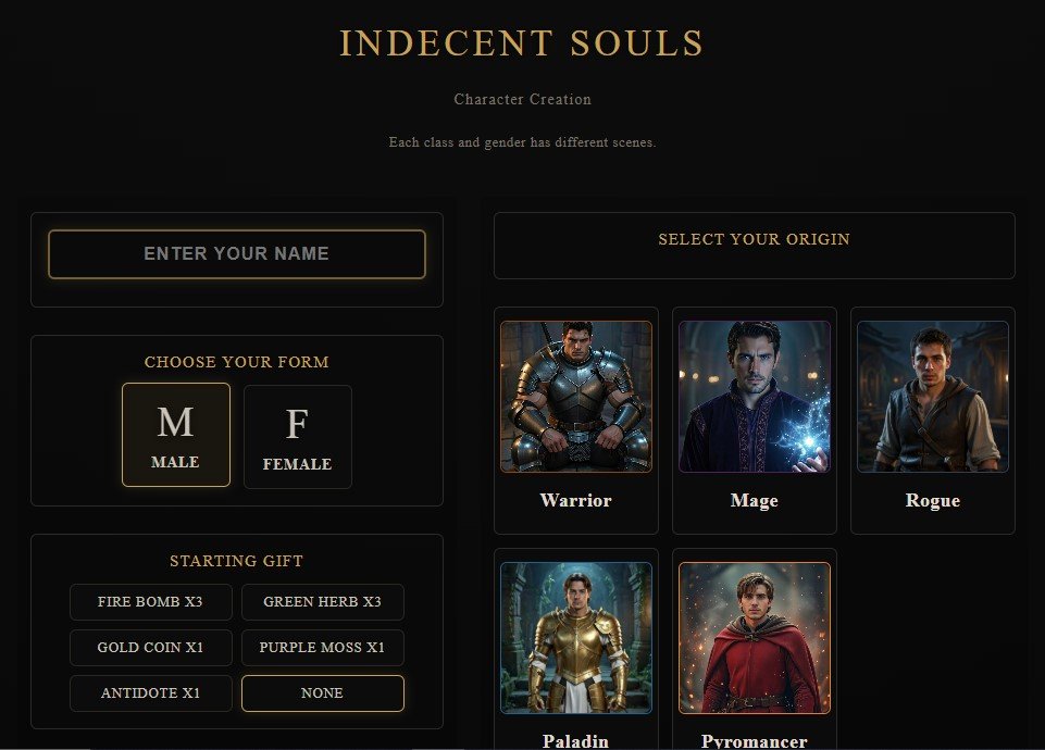 Indecent Souls is an Adult, Adventure, Role Playing, Strategy video game. Developed and published by Soaring.Mage523. It was released on 3 Feb, 2026 for Windows. In a world drowned in forgotten sins, Indecent Souls is rising — a brutal, seductive souls-like RPG where every death teaches, every flame tempts, and every secret path hides something… intimate.